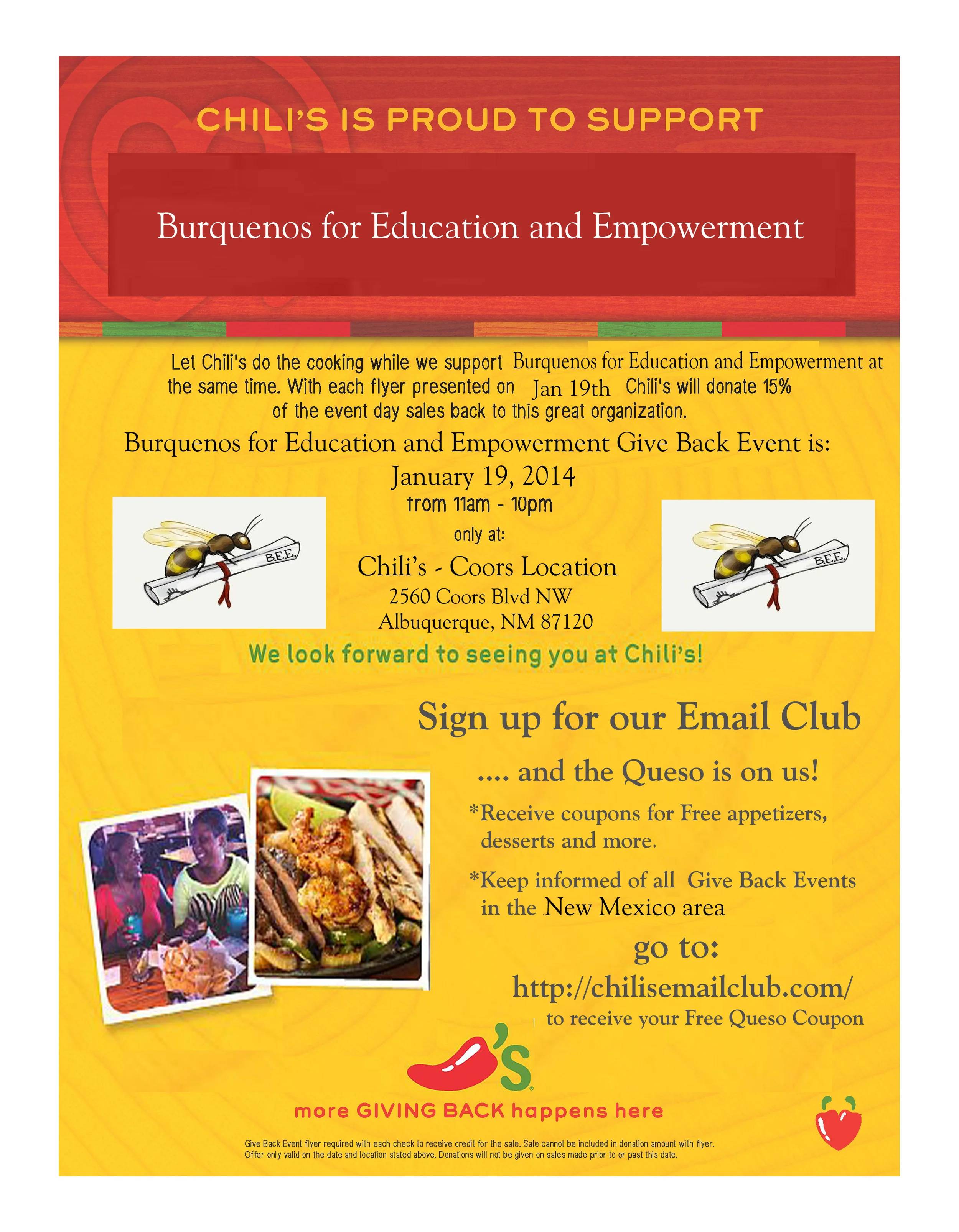 On Martin Luther King Jr. Day, January 19 Burqueños for Education and Empowerment invites you to Chili's Grill & Bar (Coors and I-40 location), in Albuquerque, New Mexico's Westside. The restaurant will be hosting a Chili's 'Give Back Event' which will benefit Burqueños for Education and Empowerment (BEE Scholarships).